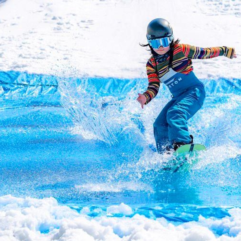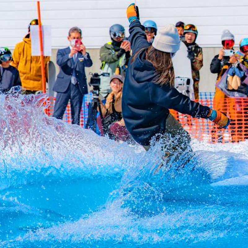 一起和挑戰者們同樂,看看誰能用滑雪或單板滑雪成功滑過全長約10公尺的水池